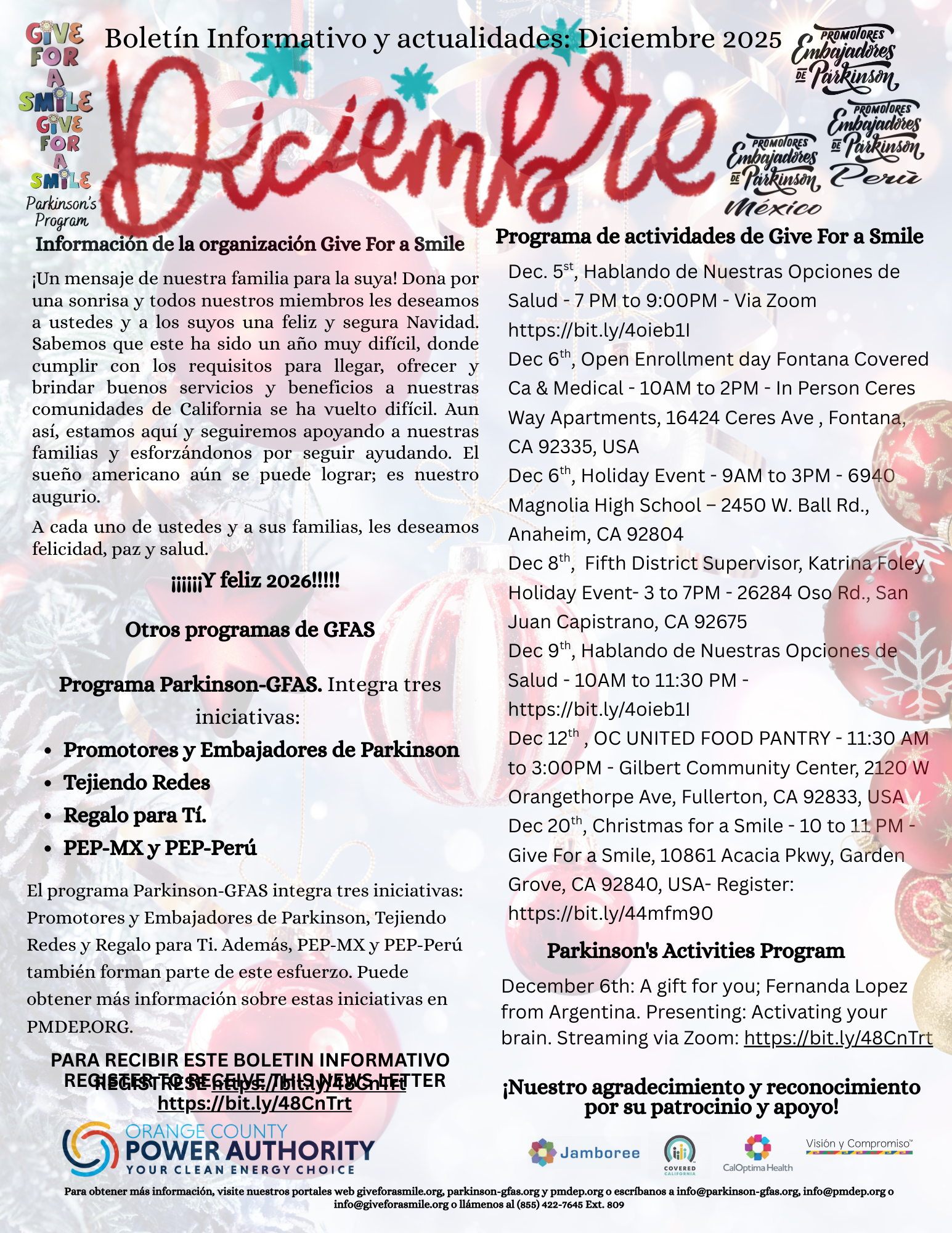 El programa de Promotores Embajadores de Parkinson surgió como una iniciativa en 2020, después de que Give For a Smile celebrara su segunda Conferencia sobre Parkinson en Anaheim, California. Cabe mencionar que una de las razones para crear este programa es que los padres de nuestra directora ejecutiva, Adriana Jiménez, padecen esta condición. Siguiendo las directrices y el modelo de Promotores de Salud implementado por Visión y Compromiso, nació nuestra misión. Hoy, hemos capacitado a más de 50 líderes comunitarios y personas interesadas en aprender más sobre esta condición, ya sea porque tienen un familiar o amigo afectado. Contamos con Promotores Embajadores de Parkinson en todo el mundo, incluyendo Argentina, México, Colombia, Perú, Nicaragua, Reino Unido, Costa Rica, Estados Unidos, Chile y Ecuador, creando y fortaleciendo lazos con nuestras comunidades a nivel mundial. Contamos con un número NPI y actualmente estamos trabajando para obtener la certificación como centro autorizado para brindar la certificación de Trabajadores de Salud Comunitaria.