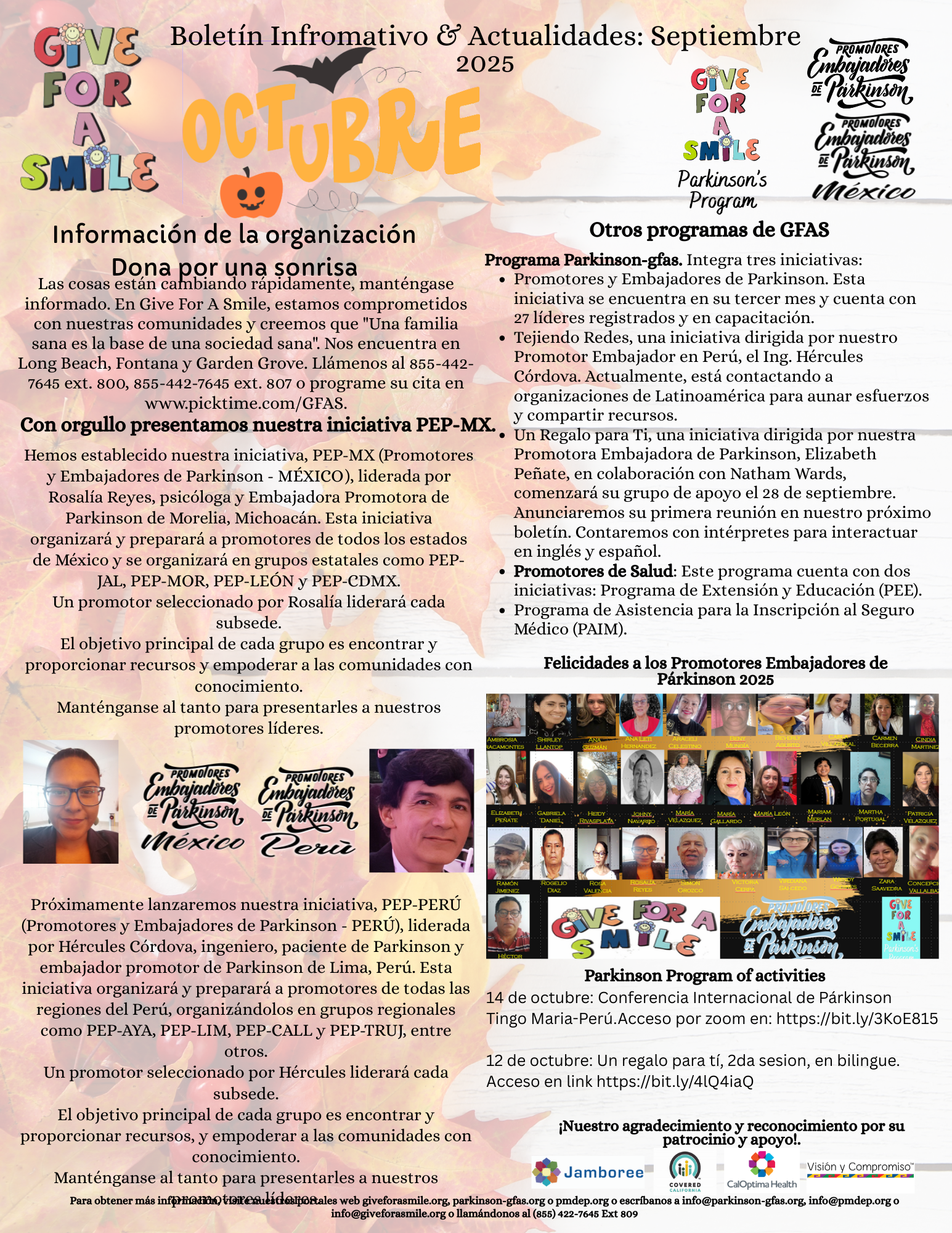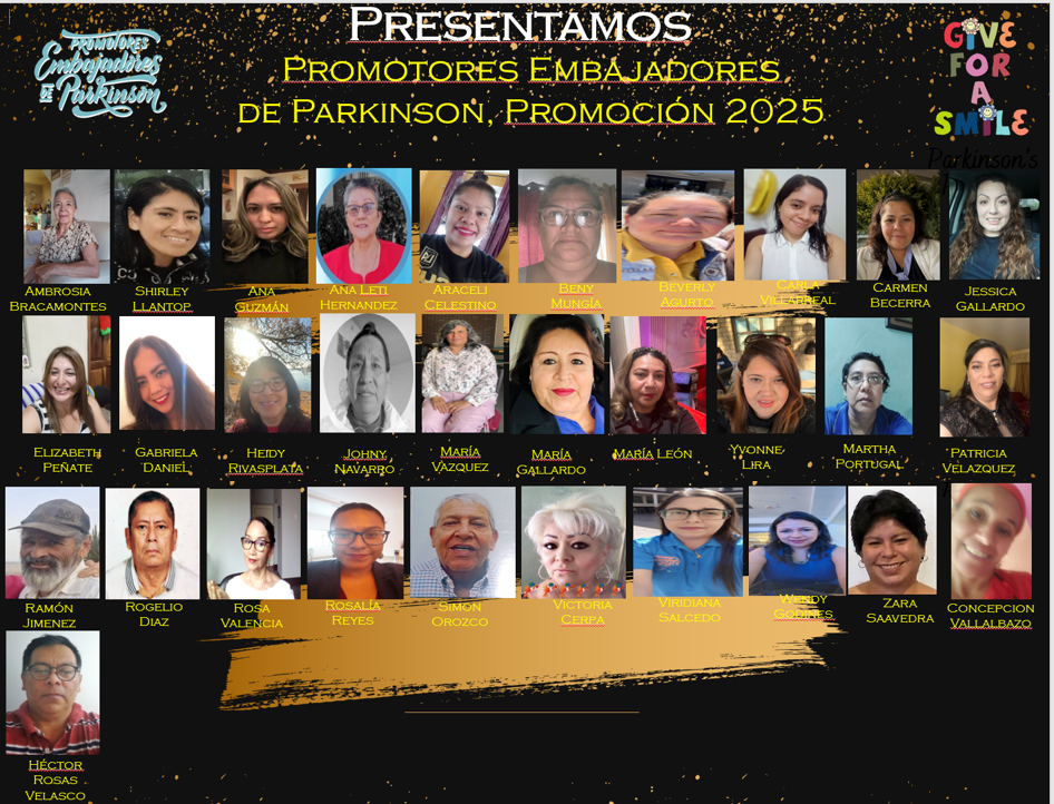 Embajadores Promotores de Parkinson es una iniciativa desarrollada por Give For a Smile y administrada bajo el programa Parkinson-GFAS. Give For a Smile es una organización sin fines de lucro 501(c)(3) cuya misión es brindar y promover información, recursos y avances relacionados con la enfermedad de Parkinson a pacientes hispanos y sus cuidadores en todo el mundo a través de líderes comunitarios y profesionales. La iniciativa también ofrece capacitación para Embajadores Promotores de Parkinson en español a través de Zoom y para todos los países hispanohablantes.