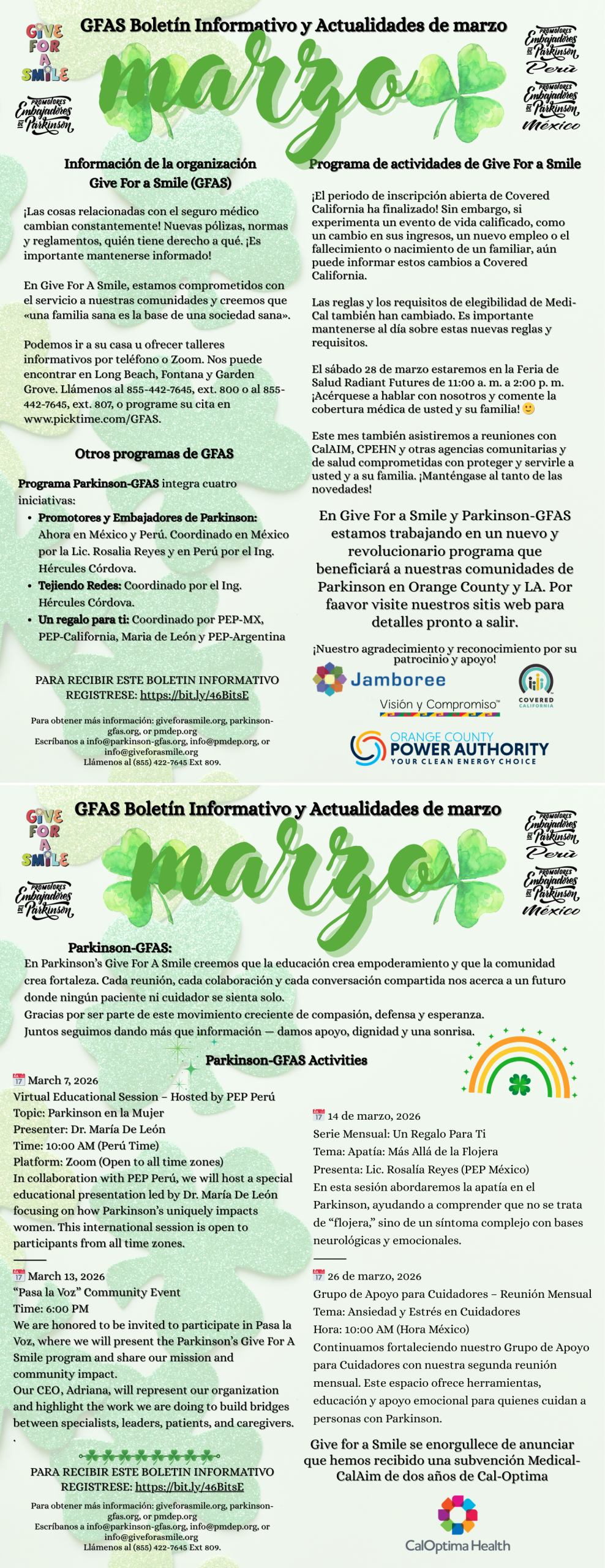 El programa de Promotores Embajadores de Parkinson surgió como una iniciativa en 2020, después de que Give For a Smile celebrara su segunda Conferencia sobre Parkinson en Anaheim, California. Cabe mencionar que una de las razones para crear este programa es que los padres de nuestra directora ejecutiva, Adriana Jiménez, padecen esta condición. Siguiendo las directrices y el modelo de Promotores de Salud implementado por Visión y Compromiso, nació nuestra misión. Hoy, hemos capacitado a más de 50 líderes comunitarios y personas interesadas en aprender más sobre esta condición, ya sea porque tienen un familiar o amigo afectado. Contamos con Promotores Embajadores de Parkinson en todo el mundo, incluyendo Argentina, México, Colombia, Perú, Nicaragua, Reino Unido, Costa Rica, Estados Unidos, Chile y Ecuador, creando y fortaleciendo lazos con nuestras comunidades a nivel mundial. Contamos con un número NPI y actualmente estamos trabajando para obtener la certificación como centro autorizado para brindar la certificación de Trabajadores de Salud Comunitaria.