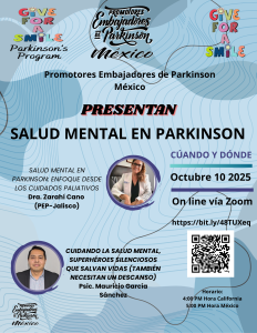 Promotortes Embajadores de Parkinson MX, Salud Mental en Párkinson. Presentado por Dra. Zarahí Cano (PEP-JAL):Enfoque desde los cuidados paliativos y al Psicólogo Mauricio García Sanchez: Cuidadndo la SaludMental, Super Héroes silenciosos que salvan Vidas. Octubre 10 desde las 4:00 PMPST. Link https://bit.ly/48TUXeq