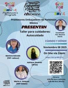 Promotortes Embajadores de Parkinson MX, Salud Mental en Párkinson. Presentado por Dra. Zarahí Cano (PEP-JAL):Enfoque desde los cuidados paliativos y al Psicólogo Mauricio García Sanchez: Cuidadndo la SaludMental, Super Héroes silenciosos que salvan Vidas. Octubre 10 desde las 4:00 PMPST. Link https://bit.ly/48TUXeq